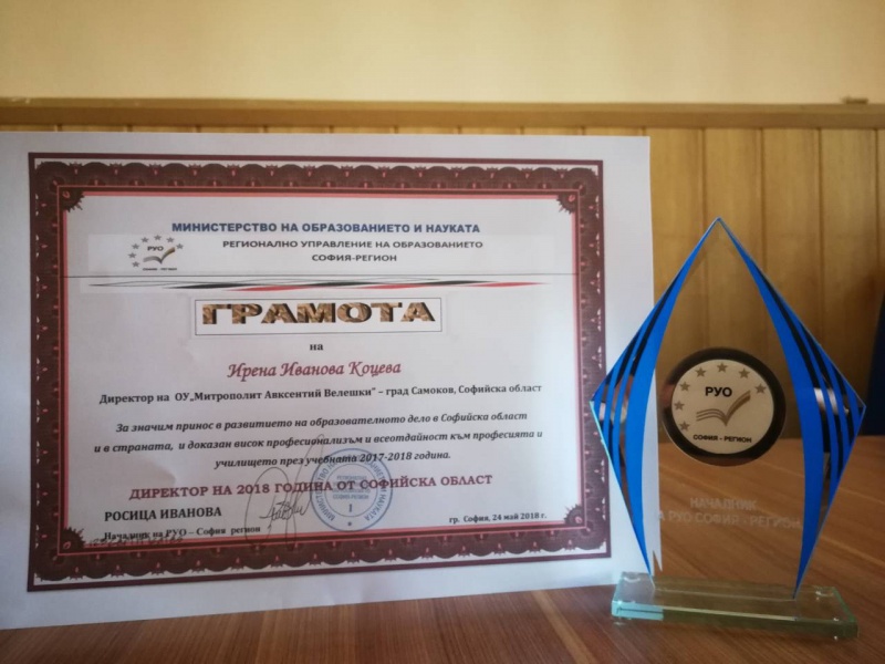 Тук се вписва и признанието за директора на ОУ „Митрополит Авксентий Велешки“ - Ирена Коцева от началника на РУО - София регион за значим принос в развитието на образователното дело в Софийска област и в страната, и доказан висок професионализъм и всеотдайност към професията и училището през учебната 2017-2018 година.