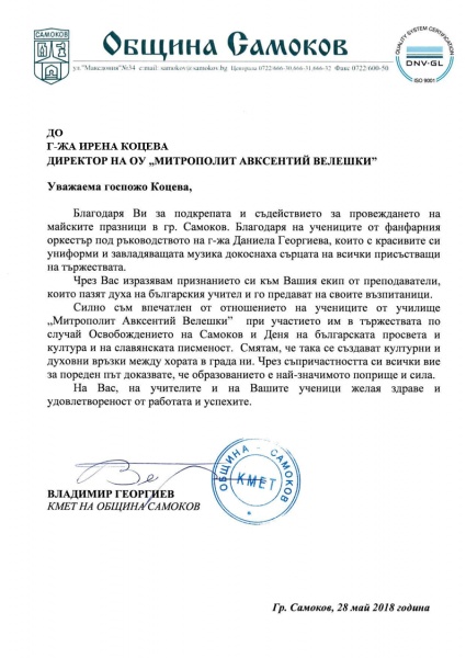 01.06.2018 Изявите и участията на нашите ученици в майските празници - с висока оценка от кмета на гр. Самоков - Владимир Георгиев.