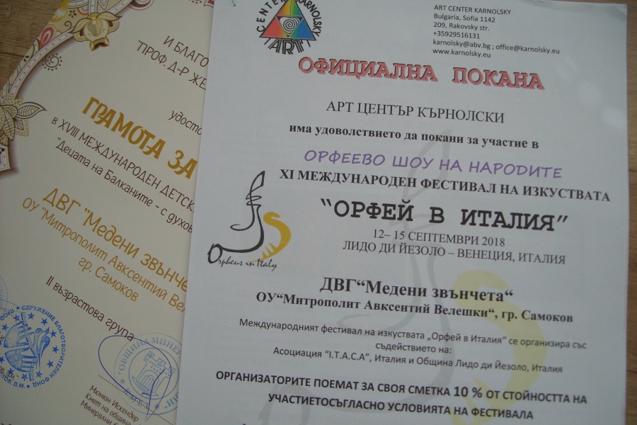 03.06.2018 Отлично представяне на XVIII Международен етнофестивал в Хасковски минерални бани на ДВГ "Медени звънчета" За отличното си представяне на XVIII Международен етнофестивал в Хасковски минерални бани, ДВГ "Медени звънчета" получи покана за участие в Италия, а Мартина Дибекова извоюва трето място във втора възрастова група.