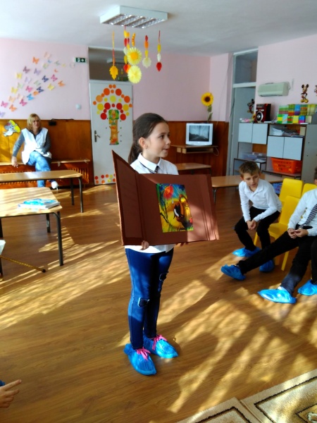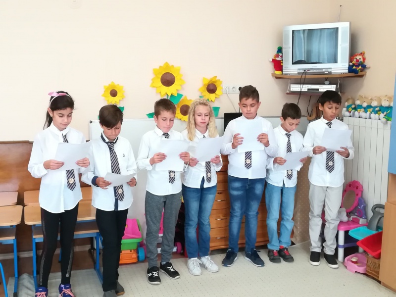 На 22.10.2018 г. ученици от IV "г" клас с учител Ваня Терзийска прочетоха на децата от Подготвителна група приказката "Човекът, змията и лисицата". Отново пред най-малките, ученици от V клас с учител Райко Попов изпълниха приказката "Неволята учи".