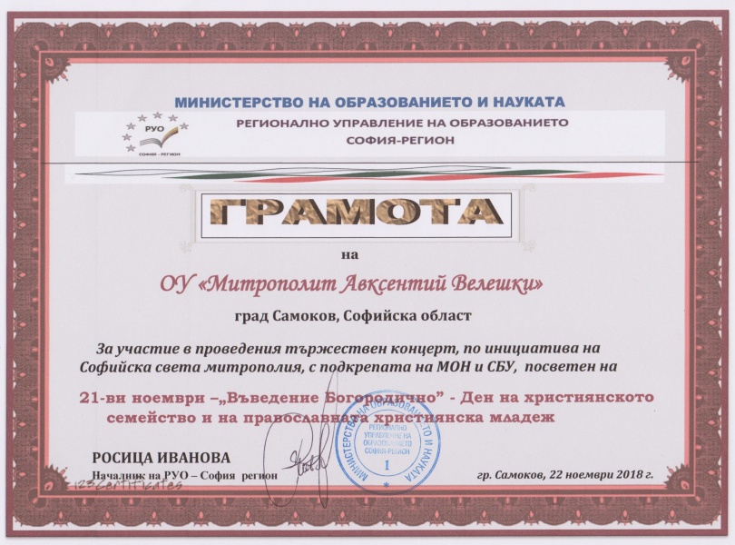 14.12.2018 Грамота за училището по повод участието в концерта, посветен на Деня на християнското семейство и младеж Грамота за участие в концерта по инициатива на Софийска света митрополия, посветен на 21 ноември - Ден на християнското семейство и на православната християнска младеж, получи ОУ "Митрополит Авксентий Велешки". На сцената в читалище-паметник "Отец Паисий" се изявиха ДВГ "Медени звънчета" с църковни песнопения, както и хорът към училището.