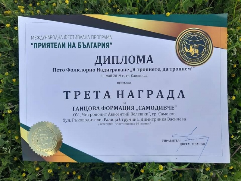 11.05.2019 Tрета награда на Петото фолклорно надиграване "Я тропнете, да тропнем!" ТФ "Самодивче" към ОУ "Митрополит Авксентий Велешки" спечели диплом и трета награда на Петото фолклорно надиграване "Я тропнете, да тропнем!", провело се на 11.05.2019 г. в гр. Сливница. Малките таланти, с ръководители г-жа Струмина и г-жа Василева, се пребориха с голямата конкуренция и донесоха радост на училището.