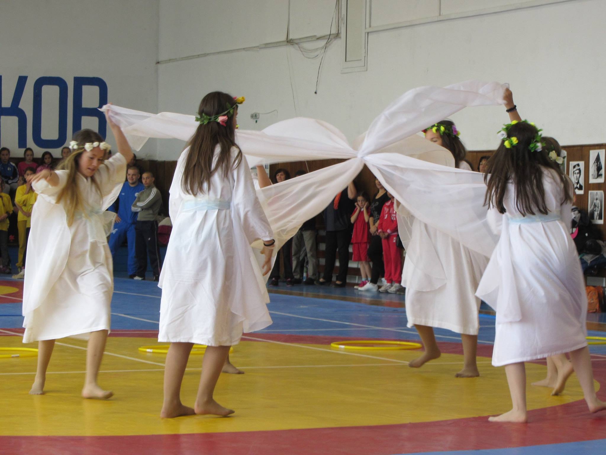 В пауза между игрите, ТФ "Самодиви" към училището изпълни красив танц на фона на песента "Облаче ле бяло".