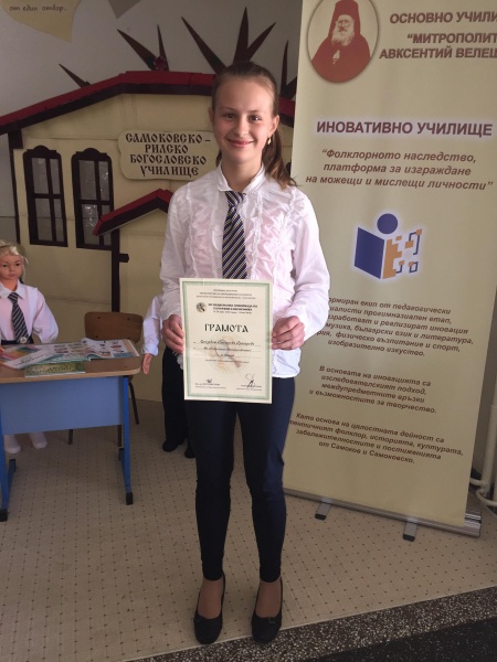 Със 173,5 точки на областният кръг по география и икономика Елизабет Григорова Григорова от ОУ,,Митрополит Авксентий Велешки", се класира на първо място в София –област в състезателна група седми клас. Това и донесе участие на националният кръг на XIV-та Национална олимпиада по география и икономика, която се проведе в гр.Стара Загора на 27-29.04.2018г.. Удостоена e с почетна грамота за участие на олимпиадата.