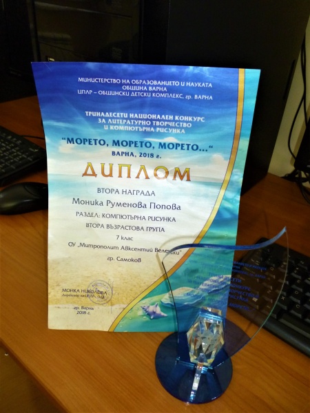 06.12.2018 Второ място от XIII Национален конкурс "Морето, морето, морето..." Диплом и статуетка за второ място от XIII Национален конкурс за литературно творчество и компютърна рисунка "Морето, морето, морето...", Варна, 2018 г. получи Моника Попова от VII "в" клас. Нейната красива компютърна рисунка бе отличена измежду 426 други творби на морска тематика, върху които са работили 354 деца от 65 населени места в страната.