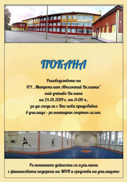 28.01.2019 Откриване на обновения физкултурен салон Обновеният физкултурен салон на ОУ „Митрополит Авксентий Велешки” бе открит в първия учебен ден от новата седмица – в понеделник, 28 януари, с демонстрации на училищните отбори по баскетбол, футбол, аеробика, под вещото ръководство на учителите по физическо възпитание и спорт г-жа Струмина и г-н Аджиков.