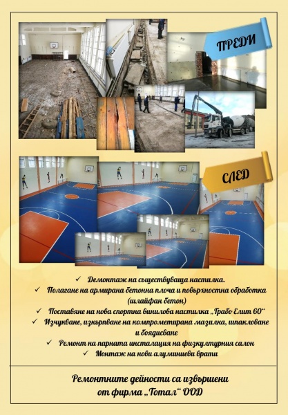Ремонтът е извършен с финансовата подкрепа на Министерството на образованието и науката и със собствени средства на училището от фирма „Тотал” ООД.