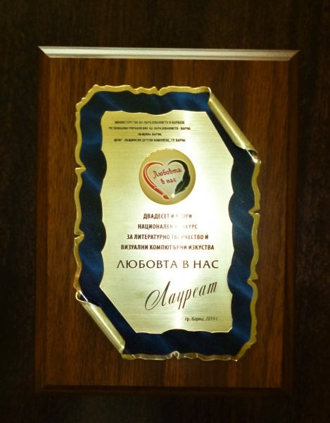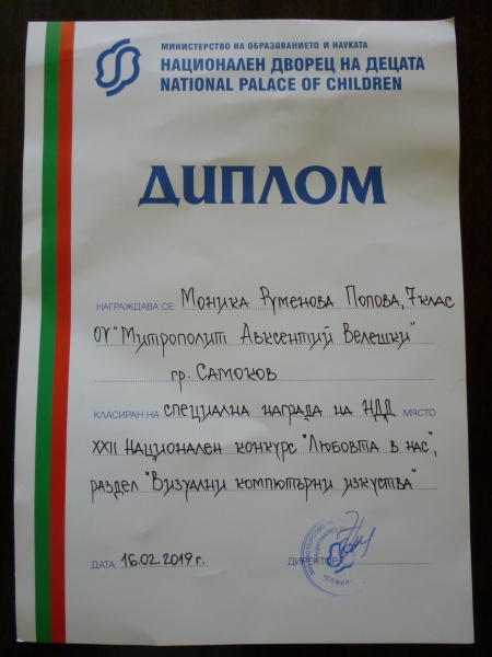26.02.2019 Специална награда от Националния дворец на децата в XXII Национален конкурс "Любовта в нас" Специална награда от Националния дворец на децата получи Моника Попова - ученичка от VII"в" клас на ОУ "Митрополит Авксентий Велешки". Наградата идва след участието на талантливата художничка в XXII Национален конкурс "Любовта в нас" с красива компютърна рисунка.