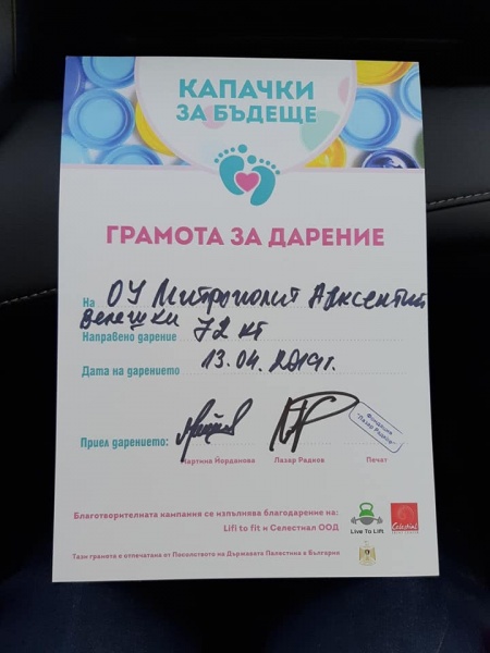 13.04.2019 "Капачки за бъдеще" Учениците от ОУ "Митрополит Авксентий Велешки" се включиха в инициативата "Капачки за бъдеще". Днес в събирателния пункт пред Националния стадион "Васил Левски", гр. София предадохме 72 кг. капачки. Ръководството на училището поздравява всички включили се в тази благородна кауза!