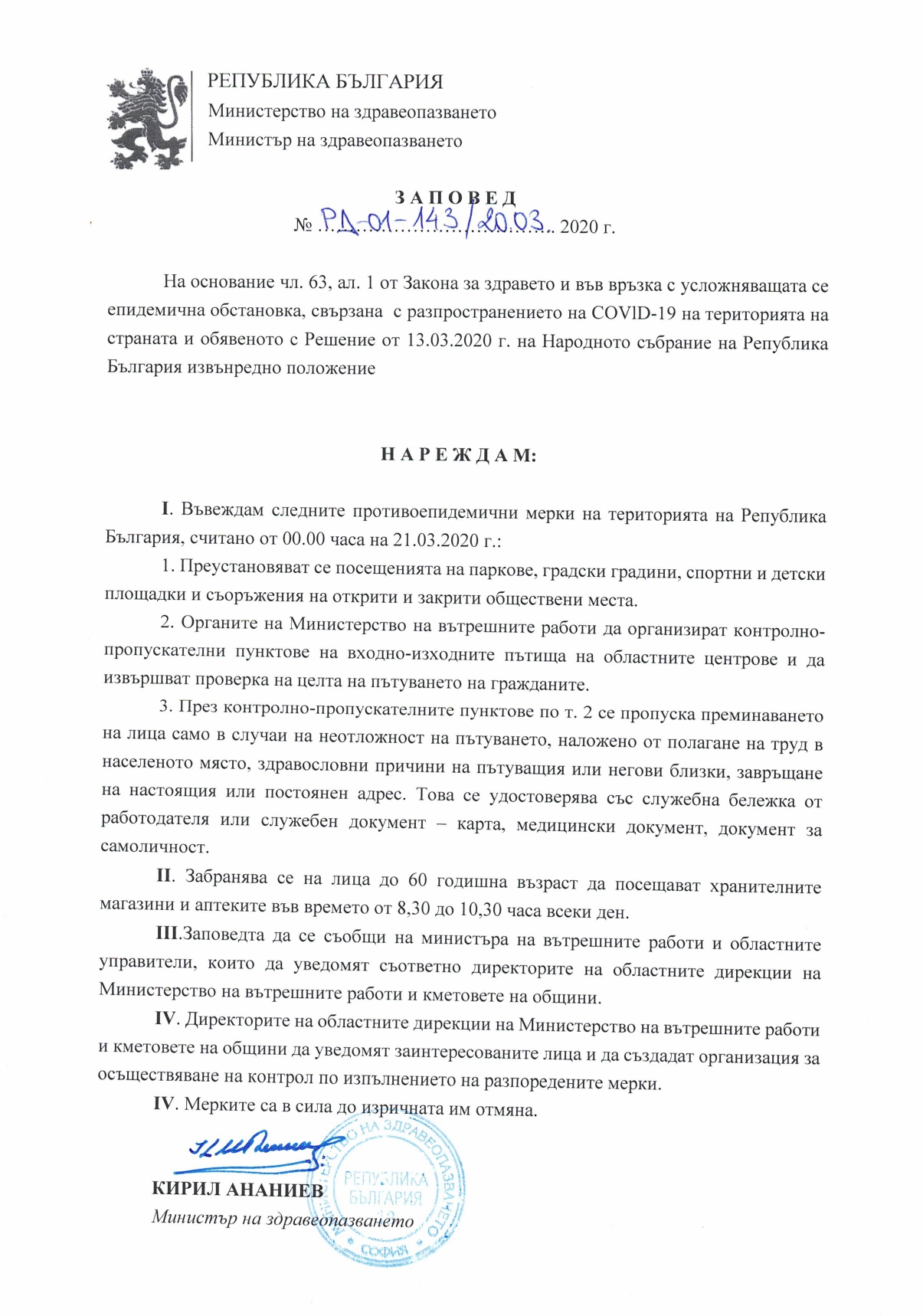 21.03.2020 Заповед на Министъра на здравеопазването