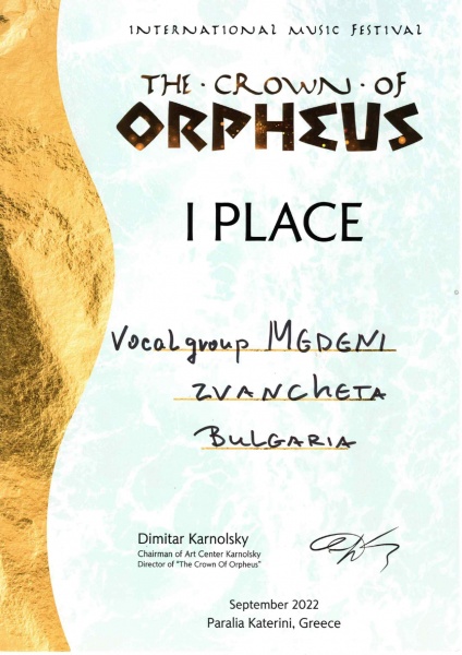 В Международния ден на музиката и поезията отново повод за гордост-първо място за ДВГ “Медени звънчета” с ръководител Даниела Георгиева, от Международния фестивал “Короната на Орфей в Гърция”