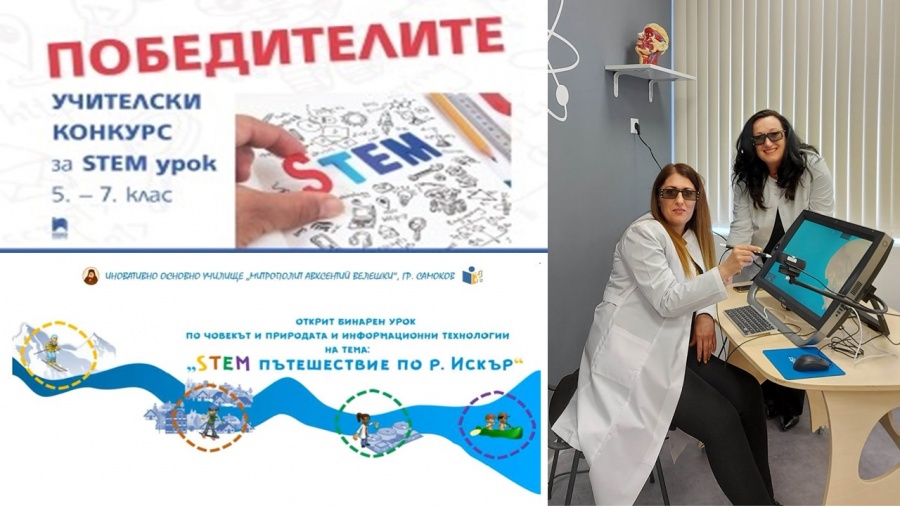 20.12.2022 Победители в учителския конкурс за STEM урок 5-7 клас С пожелание през Новата година за здраве, успех и творческо вдъхновение екипът на „Просвета“ обяви победителите в учителския конкурс за STEM урок 5-7 клас. Крайният резултат - сбор от гласовете на всички членове на журито, които оценяваха конкурсните работи - отреди трета награда за Елина Даганова и Ирина Бонева – учители от ОУ „Митрополит Авксентий Велешки“ – гр. Самоков, тема „STEM пътешествие по река Искър“ – парична награда 250 лв. / откупване на проекта/.