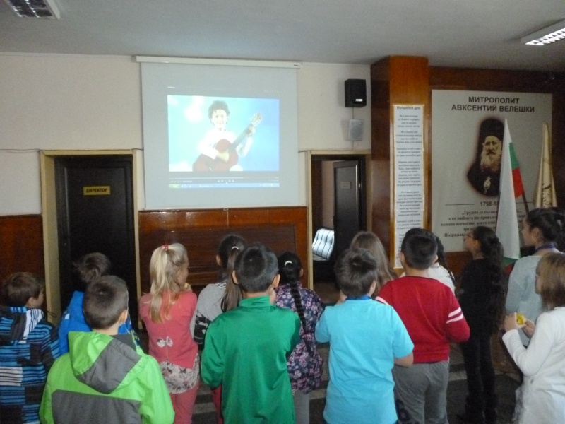 08.11.2016 В подкрепа на „Вълшебен свят” и Лидия Ганева ОУ „Митрополит Авксентий Велешки” се присъедини към инициативата на БНТ и МОН, за да подкрепи българската песен, която ще бъде изпълнена от малката Лидия Ганева на Детската Евровизия. От началото на ноември в продължение на целия месец песента „Вълшебен свят” звучи като училищен звънец и в голямото междучасие. „Макар че ние не можем да гласуваме за нашата българска песен в Детската Евровизия, поне е важно да подкрепим таланта на едно българско дете”, подчерта директорът на учебното заведение Ирена Коцева.