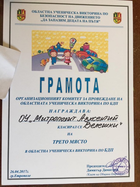 26.04.2017 Трето място в областния кръг за отбора по БДП На 26 април в град Етрополе се проведе областният кръг на състезанието по Безопасност на движението – „Да запазим децата на пътя”, в което взе участие и самоковкият отбор от ОУ „Митр. Авксентий Велешки” под ръководството на Христоско Чамов. Учениците станаха първенци на общинското състезание, което се проведе на 21 април в училището. На местно ниво отборът на ОУ „Митр. Авксентий Велешки” успя да надпревари и в трите кръга останалите четири отбора от различни училища в града, което автоматично ги изпрати на областния кръг.