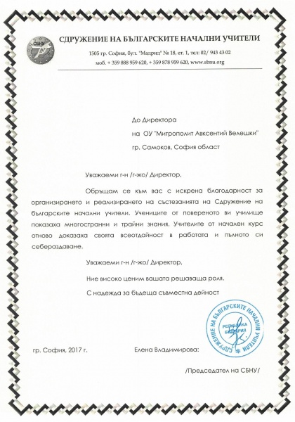30.06.2017 Благодарствено писмо от СБНУ