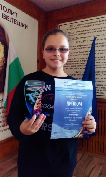 05.12.2017 Първо място в XII Национален конкурс "Морето, морето, морето..." Първо място за Моника Попова от 6''в'' клас на ОУ "Митрополит Авксентий Велешки" в XII Национален конкурс "Морето, морето, морето..." за литературно творчество и компютърна рисунка, Варна 2017 г. Наградата на Моника е в категория "Компютърна рисунка", втора възрастова група V - VIII клас. Конкурсът се организира от Министерство на образованието и науката, община Варна и ЦПЛР - Общински детски комплекс, гр. Варна.
